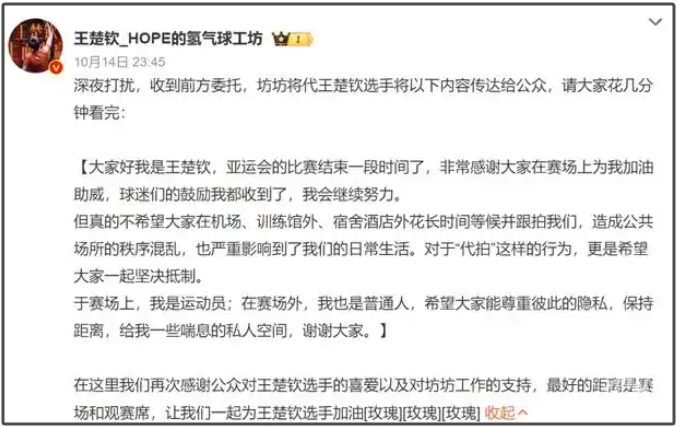 之后,王楚钦曾通过@王楚钦_HOPE的氢气球工坊 发文称,坚决抵制“代拍”行为,希望大家能尊重彼此的隐私。