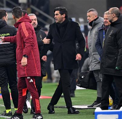 12月29日,AC米兰队主教练丰塞卡(中)在被红牌警告后离场。当日,在2024-2025赛季意大利足球甲级联赛第18轮比赛中,AC米兰队主场1比1战平罗马队。新华社发(阿尔贝托·林格利亚摄)