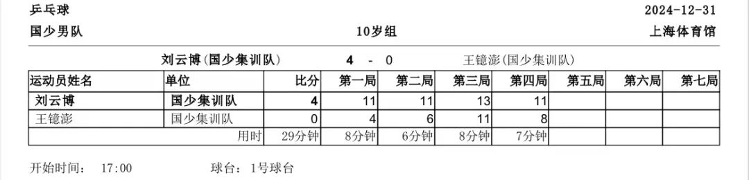 在乒超总决赛间隙,2024年国少集训队(第五期)选拔赛各组别的冠亚军决赛也在同一片场地进行,今天结束的几场决赛成绩如下——