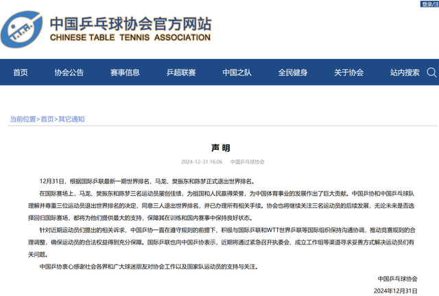 2024年12月31日,根据国际乒联最新一期世界排名,马龙、樊振东和陈梦正式退出世界排名。中国乒协在官网发布声明,回应社会关切。