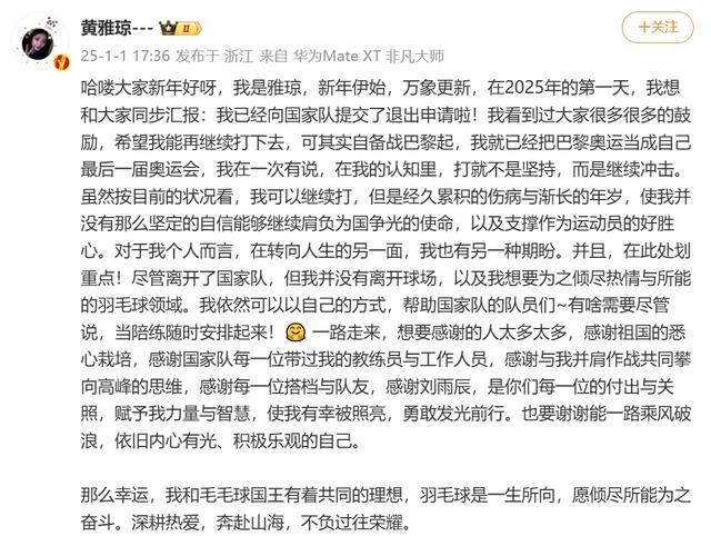 1月1日,中国羽毛球队队员黄雅琼通过个人微博表示,自己已经向国家队提交了退出申请。黄雅琼还表示,尽管离开了国家队,但并没有离开球场,依然可以帮助国家队的队员。