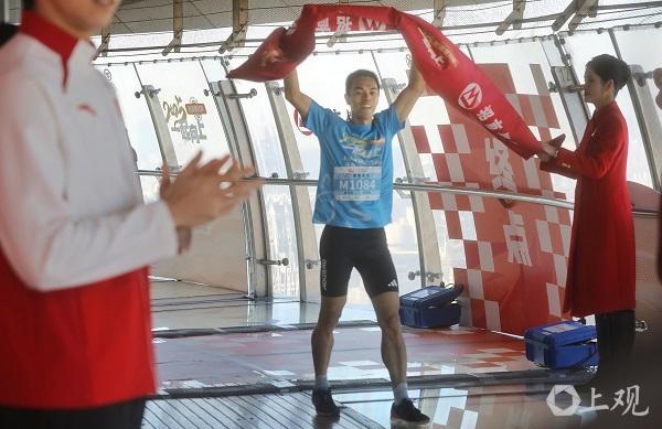 随着比赛发令枪声的响起,选手们如离弦之箭从东方明珠城市广场出发,向着259米全透明悬空观光廊和90米户外观光廊的终点奋力冲刺。