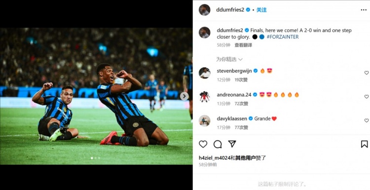 晋级意超杯决赛后,梅开二度的邓弗里斯更新了社交媒体。
