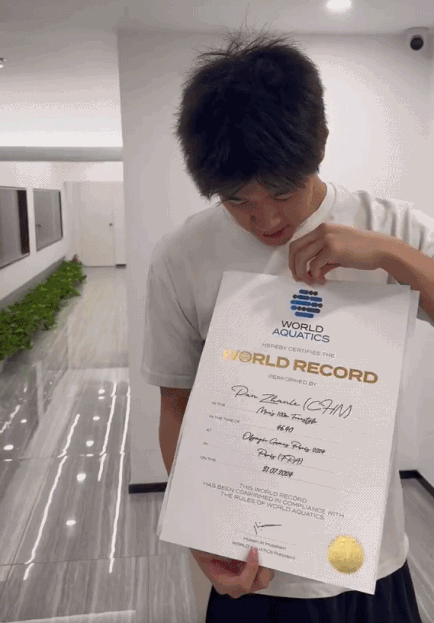 2024年9月10日,奥运冠军潘展乐发布视频,向网友展示了游泳世界纪录证书。