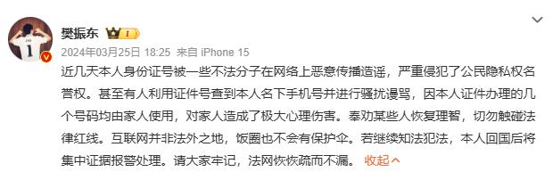 2024年3月,樊振东曾发文斥责泄露其身份证号的行为。樊振东称,有人利用证件号查到其本人名下手机号进行骚扰谩骂,对使用号码的家人造成了极大的心理伤害,他将收集证据报警处理。