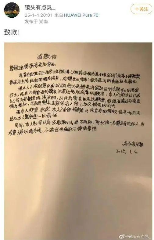 1月4日,微博名为“镜头有点晃_”的网友发布手写道歉信,表示自己曾用“养个啵丝猫”的账号发布了侵害樊振东隐私权的信息,向樊振东致歉,恳请樊振东能原谅其“无知又错误的行为”。