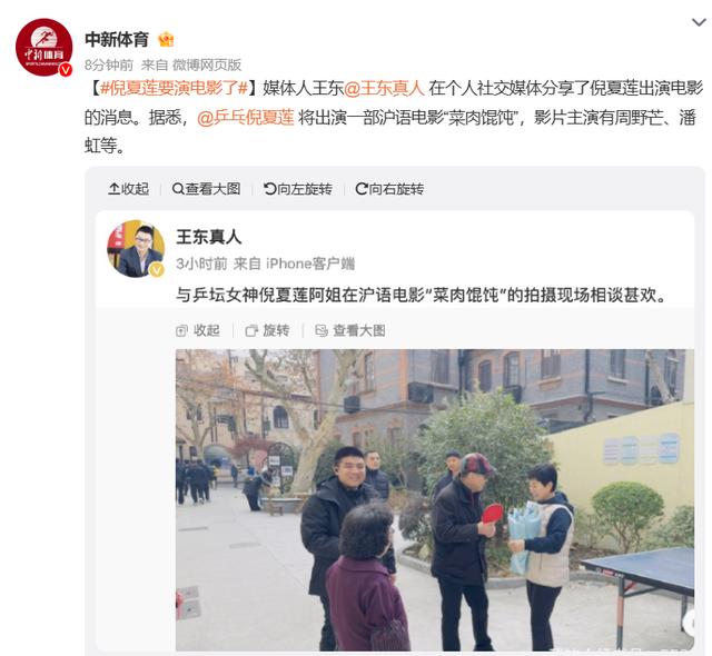 媒体人王东在个人社交媒体分享了倪夏莲出演电影的消息,并写道:“与乒坛女神倪夏莲阿姐在沪语电影‘菜肉馄饨’的拍摄现场相谈甚欢。”