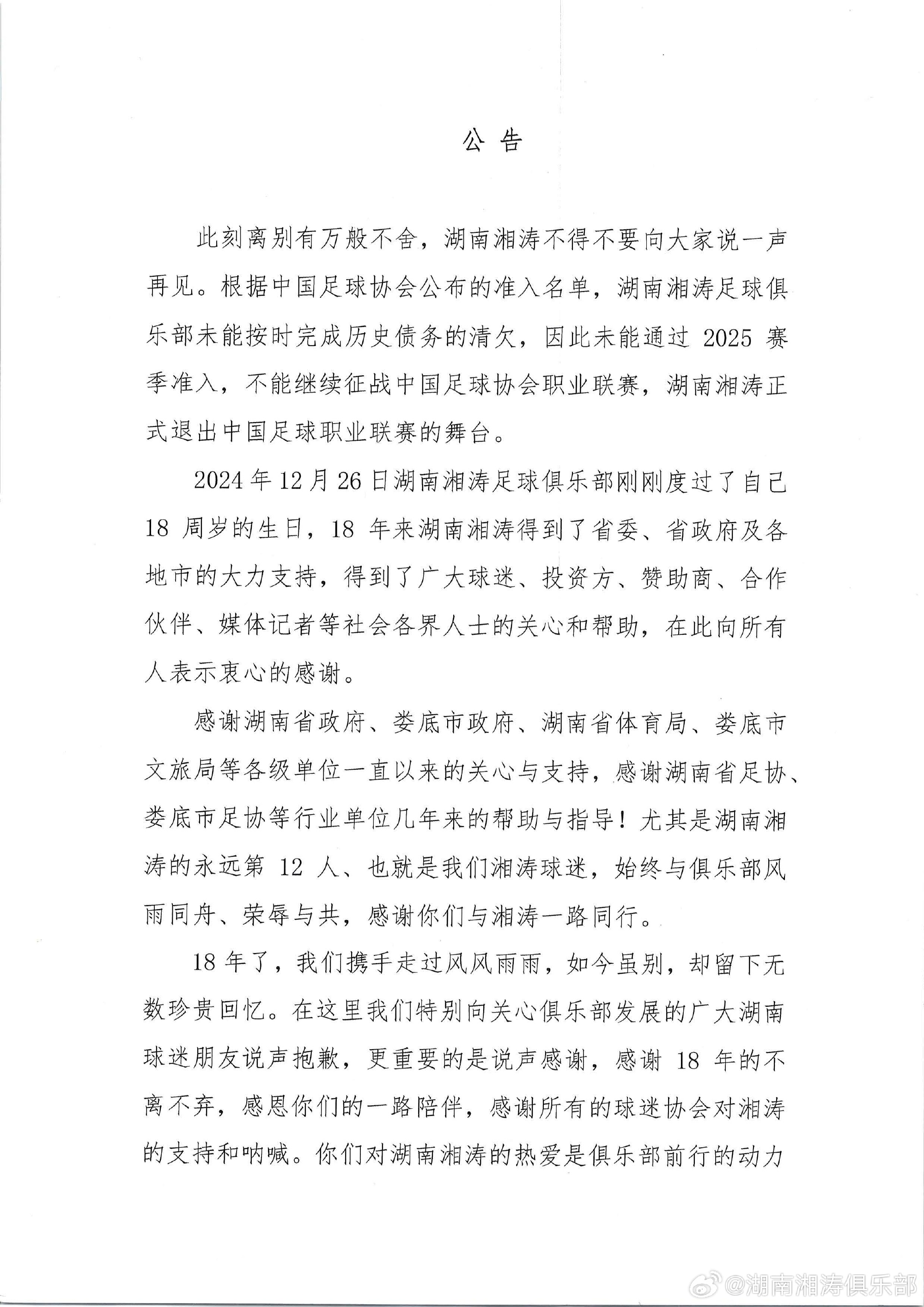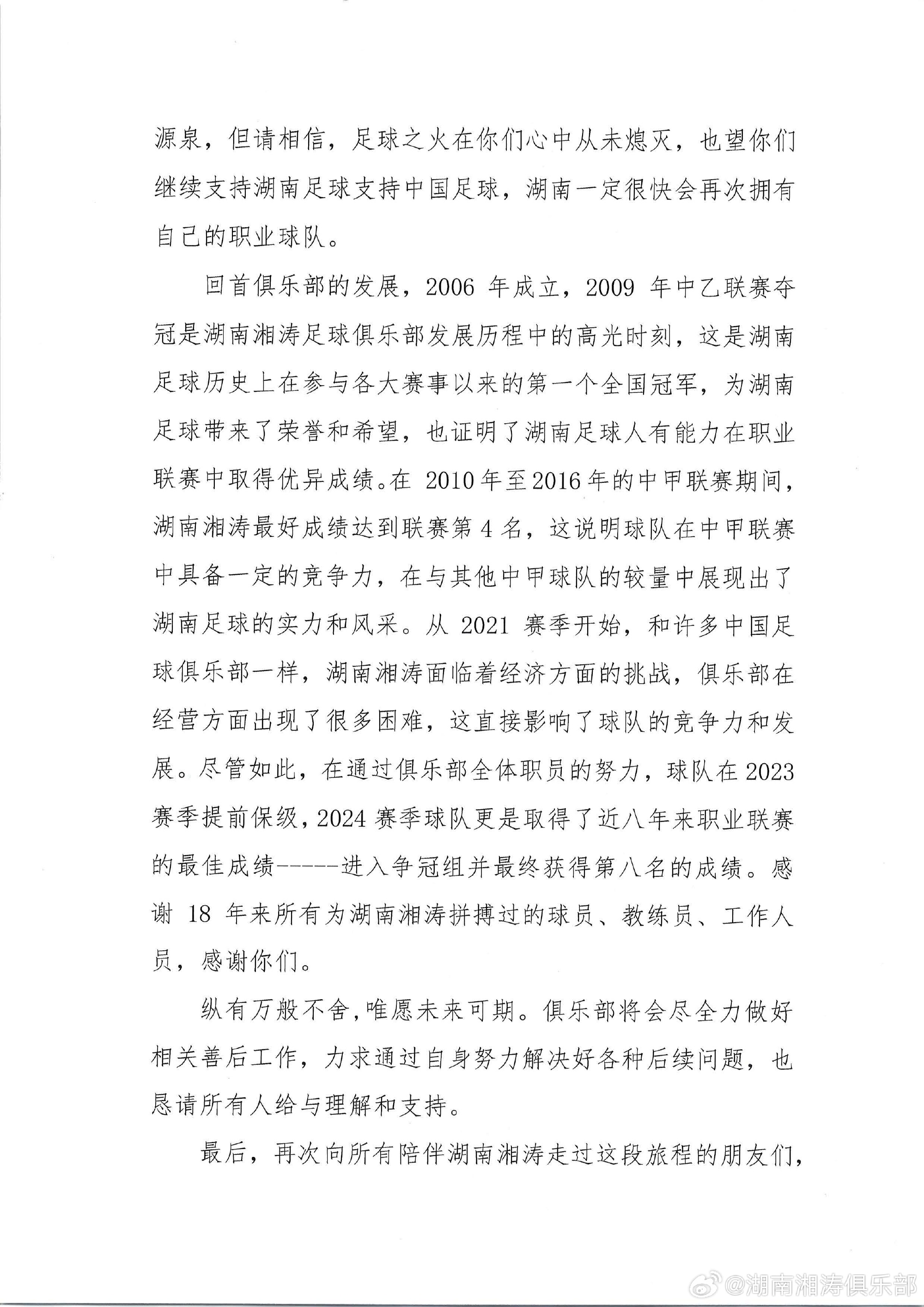 湖南湘涛官方宣布,退出中国职业联赛的舞台!