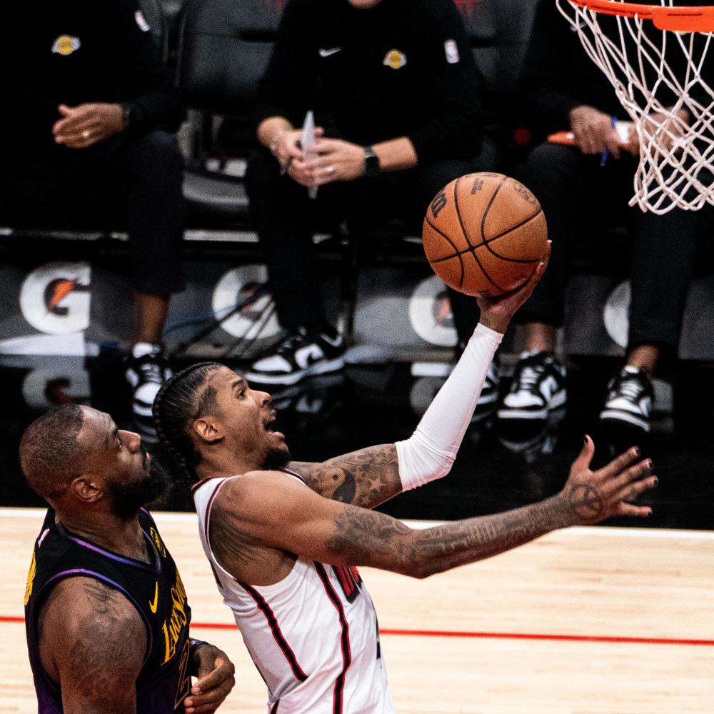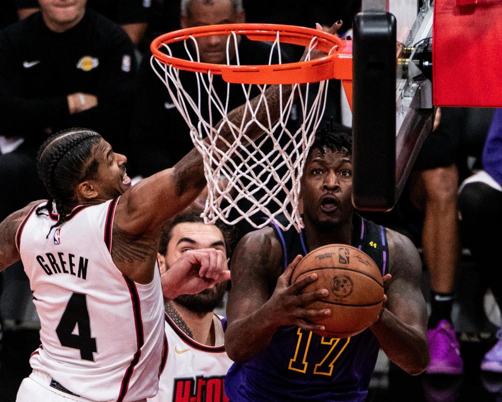 1月5日,湖人队球员多里安·芬尼-史密斯(右)在比赛中上篮。新华社发(陈晨摄)