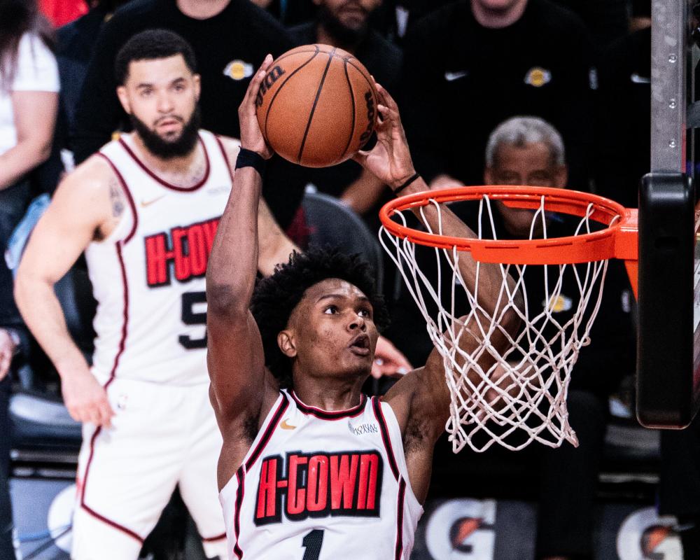 1月5日,火箭队球员阿门·汤普森(前)在比赛中扣篮。新华社发(陈晨摄)