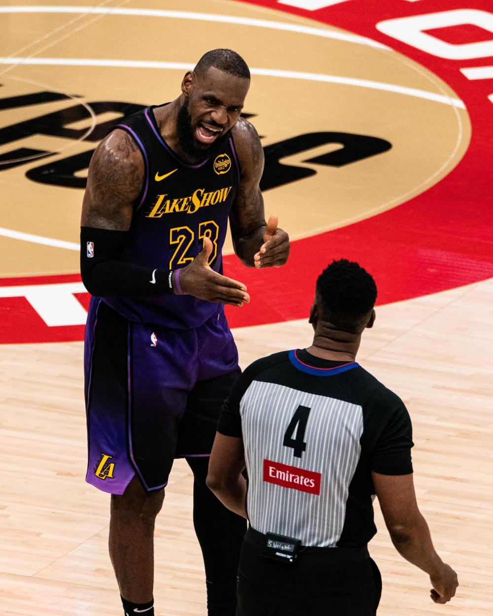1月5日,湖人队球员勒布朗·詹姆斯(左)在比赛中与裁判争论。新华社发(陈晨摄)