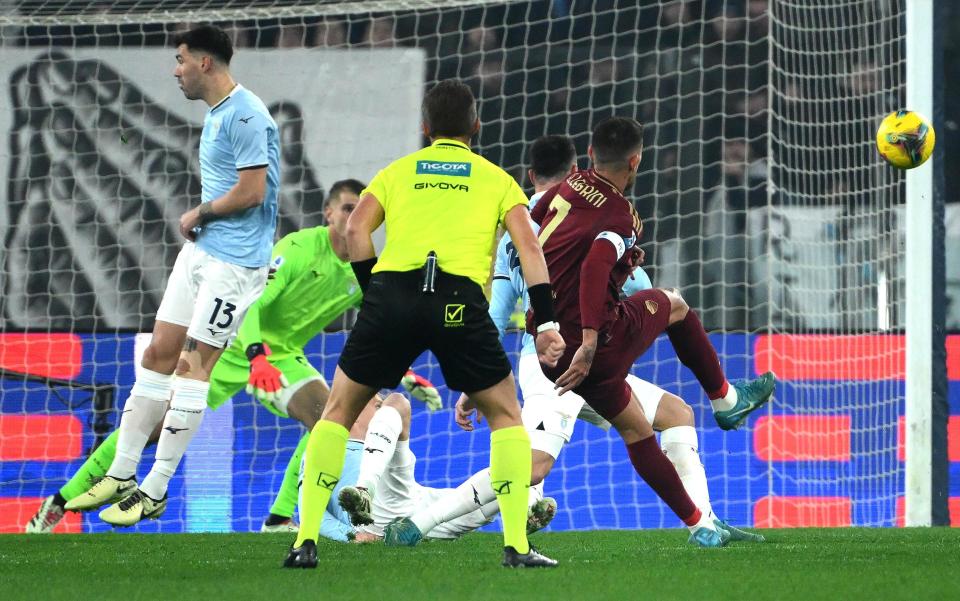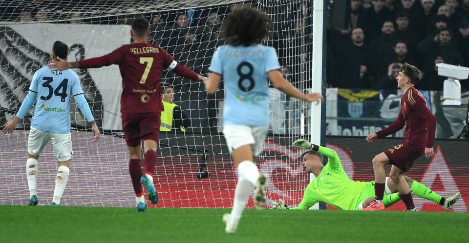 1月5日,罗马队球员佩莱格里尼(右一)攻入球队首球。新华社/欧新