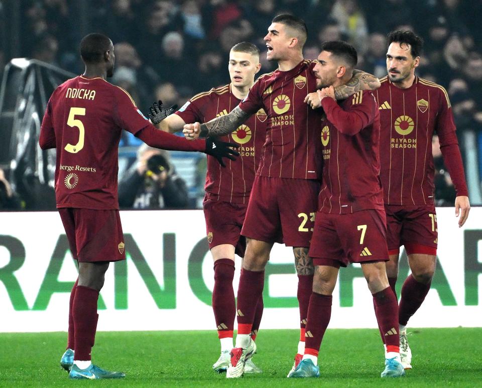 1月5日,罗马队球员萨勒马克尔斯(中)攻入球队第二球后与队友庆祝。新华社/欧新