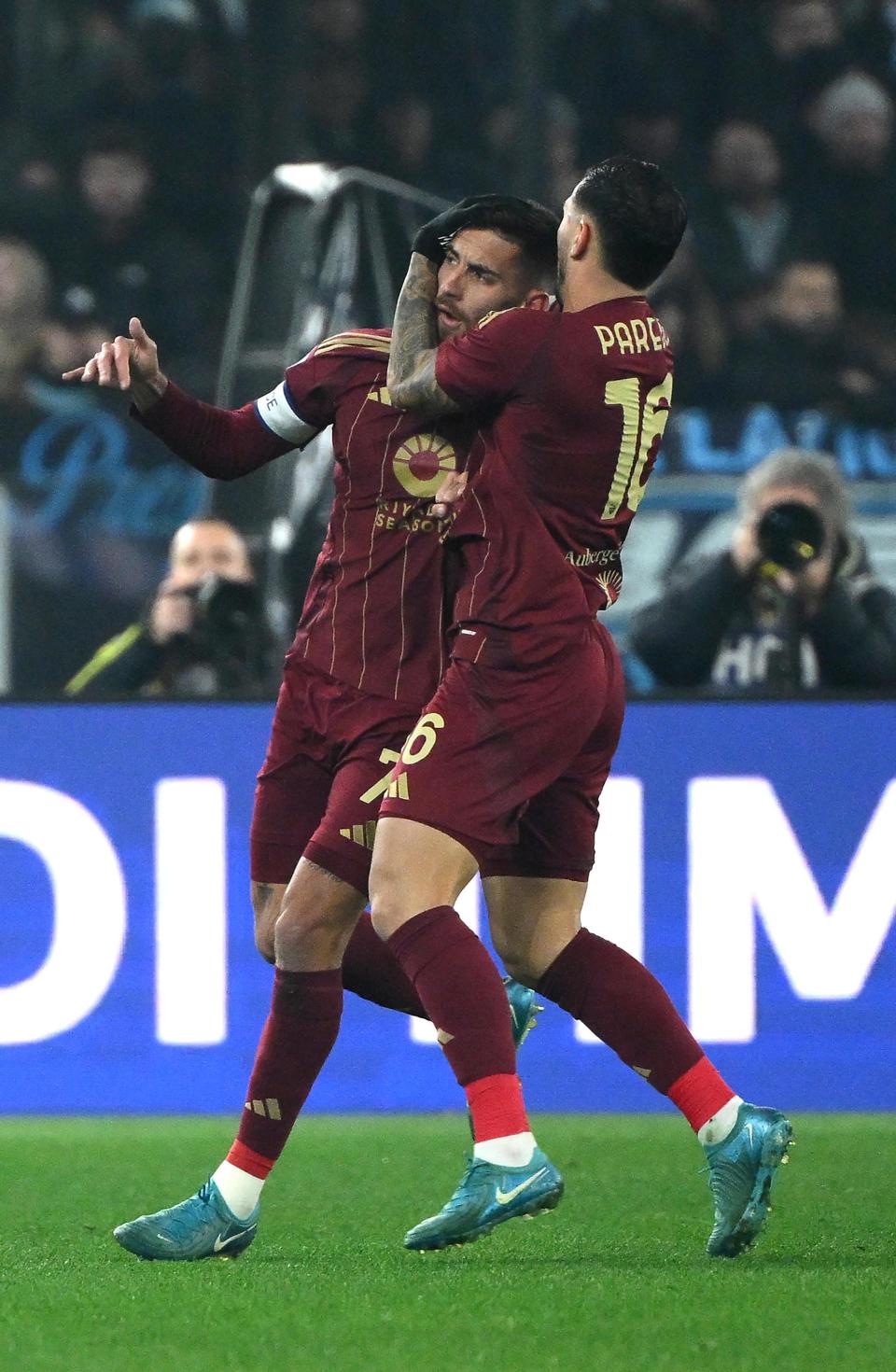 1月5日,罗马队球员佩莱格里尼(左)攻入球队首球后与队友庆祝。新华社/欧新