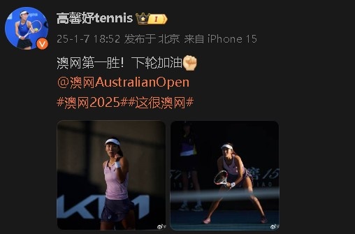 赛后,高馨妤更新社媒庆祝胜利:澳网第一胜!下轮加油。