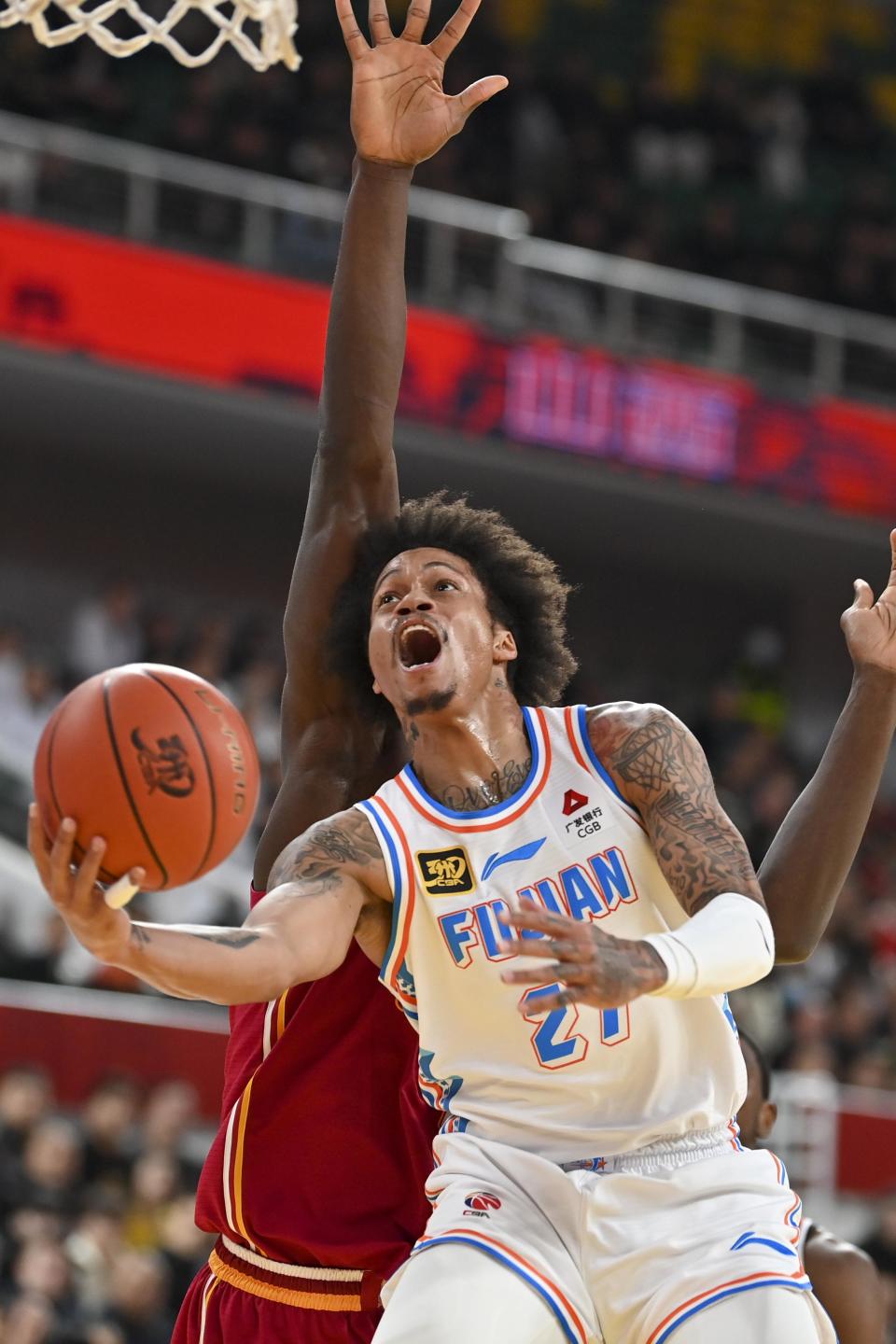 1月7日,福建晋江文旅队球员约瑟夫·杨(前)在比赛中突破上篮。新华社记者 杨晨光 摄