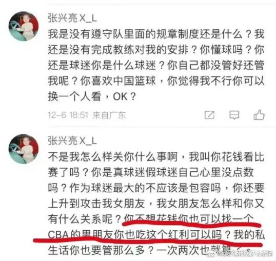 张兴亮此前在评论区开火:你不想花钱你可以找一个CBA的男朋友你也吃这个红利可以吗?