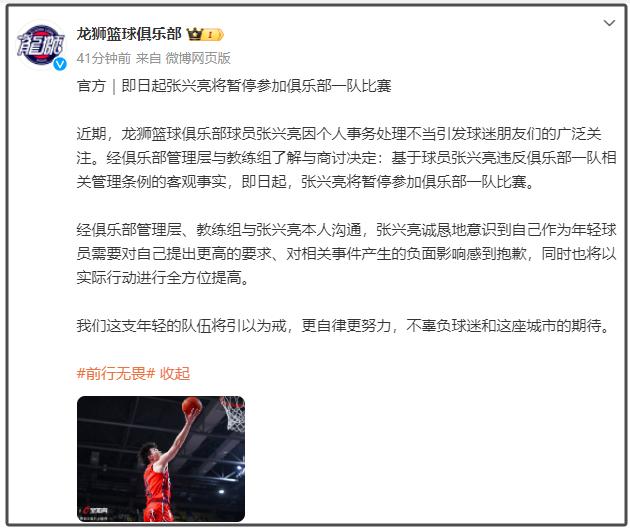 刚刚,广州龙狮男篮官方宣布,基于球员张兴亮违反俱乐部一队相关管理条例的客观事实,即日起,张兴亮将暂停参加俱乐部一队比赛。