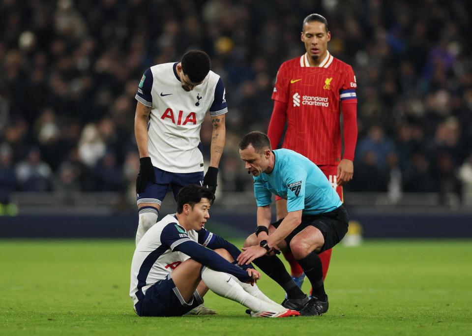 1月8日,热刺队球员孙兴慜(下)在比赛中受伤。新华社/路透