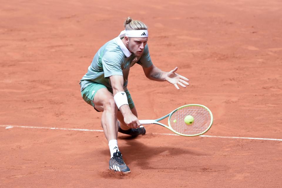 2024年4月26日,福基纳在比赛中回球。当日,在2024马德里网球公开赛男子单打第二轮比赛中,中国选手商竣程0:2不敌西班牙选手福基纳,无缘下一轮。新华社发(古斯塔沃·巴连特摄)