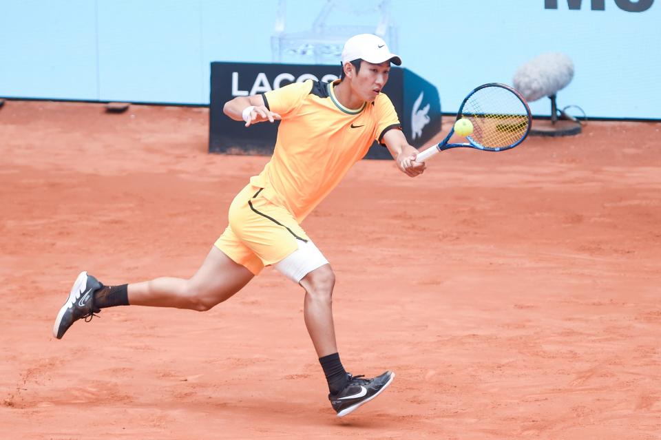 2024年4月26日,商竣程在比赛中回球。当日,在2024马德里网球公开赛男子单打第二轮比赛中,中国选手商竣程0:2不敌西班牙选手福基纳,无缘下一轮。新华社发(古斯塔沃·巴连特摄)