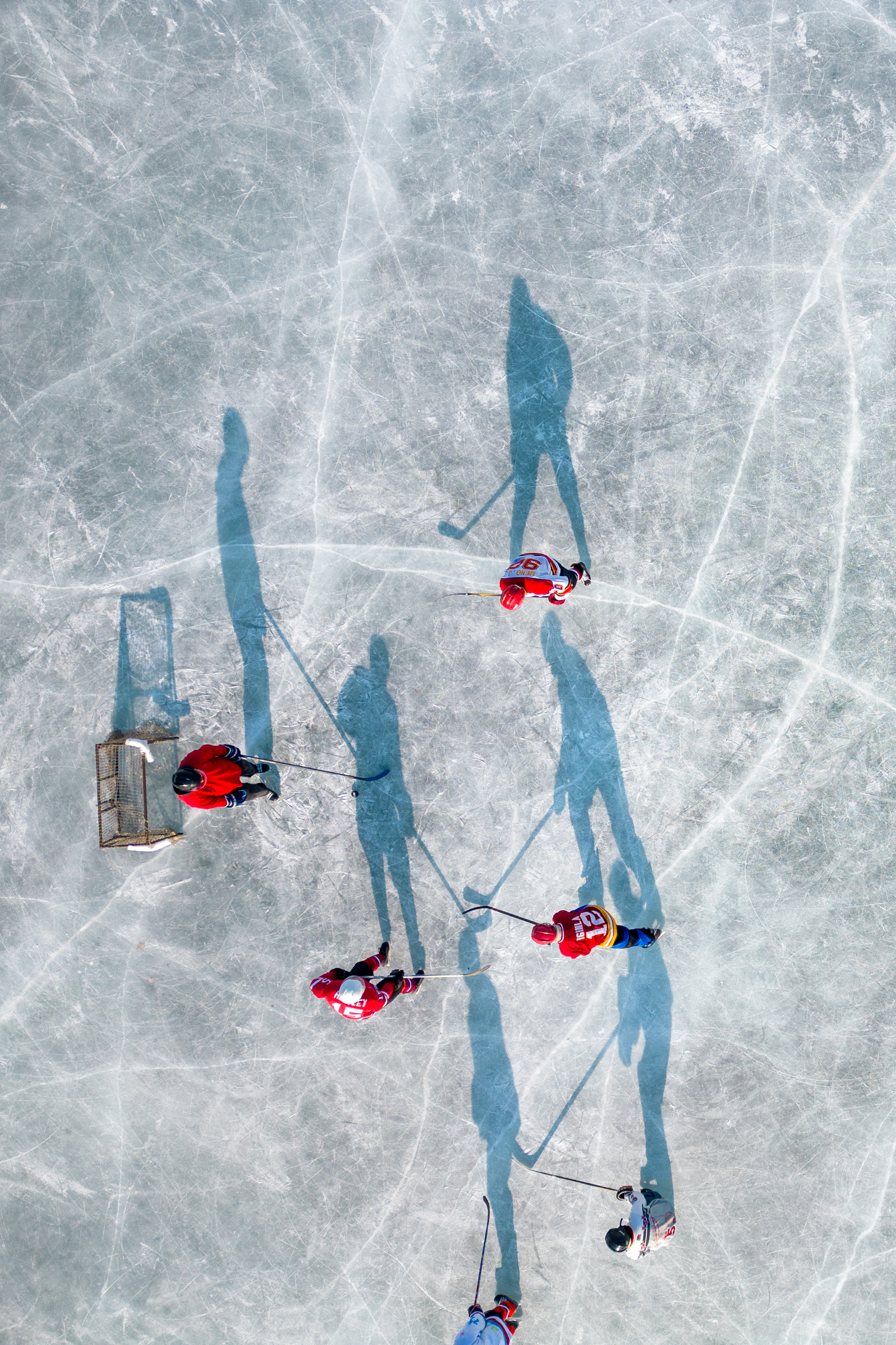 1月18日,人们在哈尔滨市丁香公园内打冰球(无人机照片)。新华社记者 张涛 摄