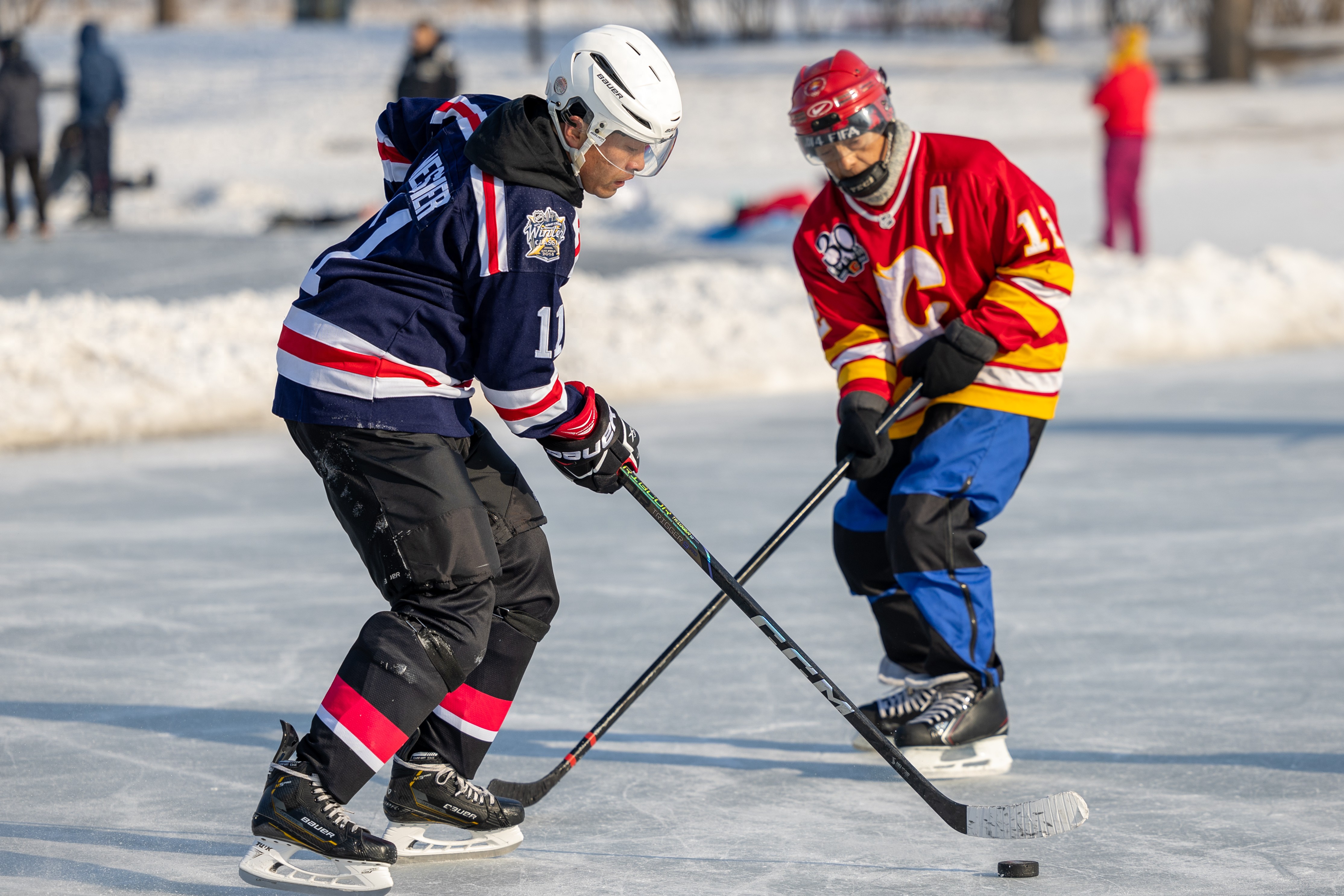 1月18日,人们在哈尔滨市丁香公园内打冰球。新华社记者 张涛 摄