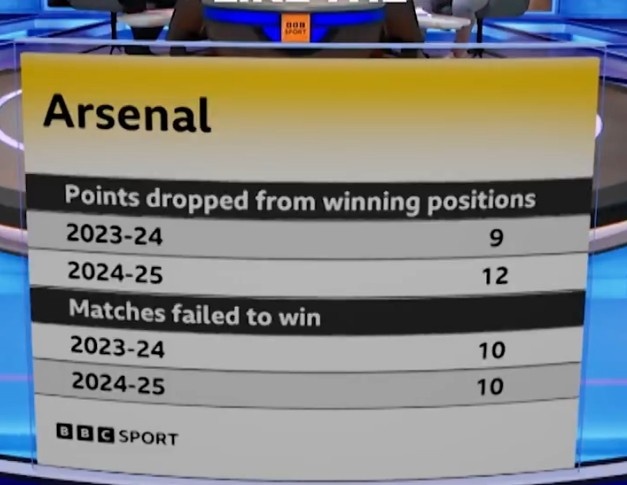 阿森纳本赛季英超领先情况下丢掉12分,已超过上赛季(9分)。