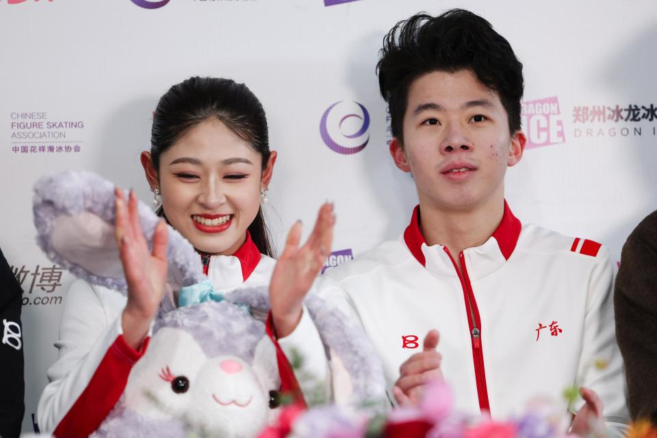 1月19日,广东省黄村体育训练中心组合肖紫兮(左)/何凌昊在得知分数后庆祝。最终他们以171.70分的总成绩获得冰上舞蹈冠军。新华社记者 许雅楠 摄