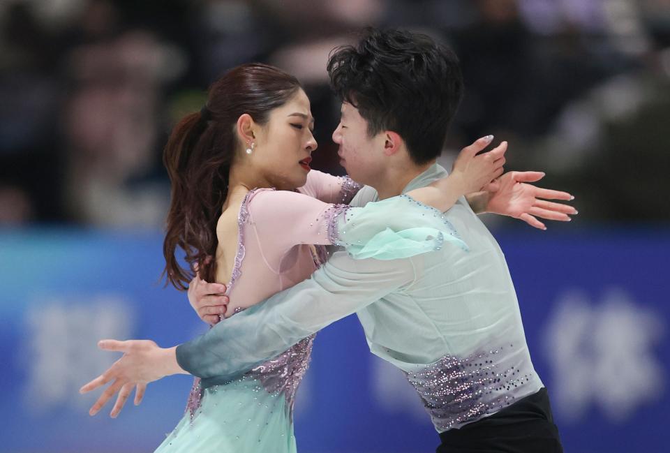 1月19日,广东省黄村体育训练中心组合肖紫兮(左)/何凌昊在冰上舞蹈自由舞比赛中。最终他们以171.70分的总成绩获得冰上舞蹈冠军。新华社记者 许雅楠 摄