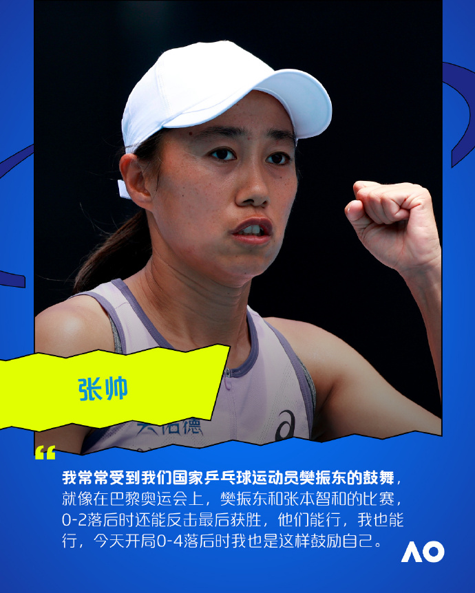 曾经在2019年澳网夺得该项冠军的张帅时隔六年再进女双八强,也为21日的36岁生日赢得了最好的礼物。谈起这次逆转时,她说受到了乒乓球运动员马龙和樊振东在巴黎奥运会上的鼓舞。