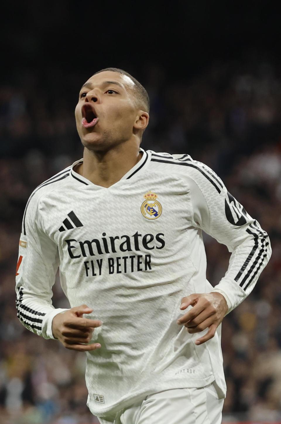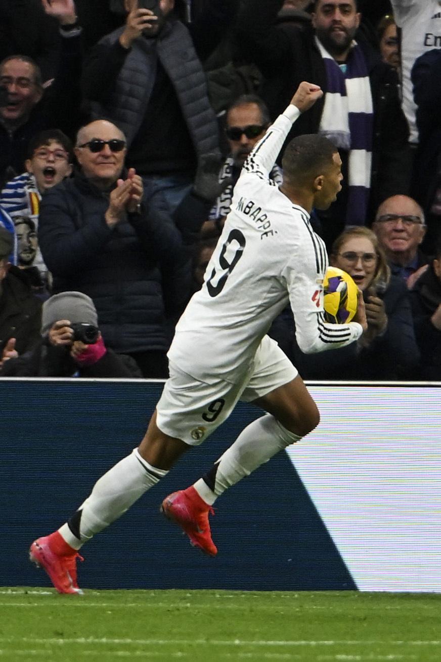 1月19日,皇家马德里队球员姆巴佩庆祝攻入球队第三球。新华社/欧新
