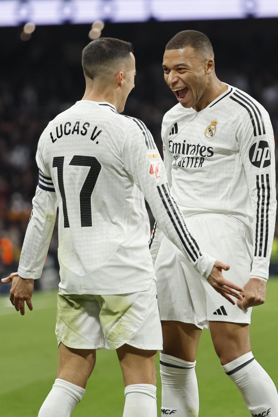 1月19日,皇家马德里队球员姆巴佩(右)攻入球队第三球后与队友巴斯克斯庆祝。新华社/欧新