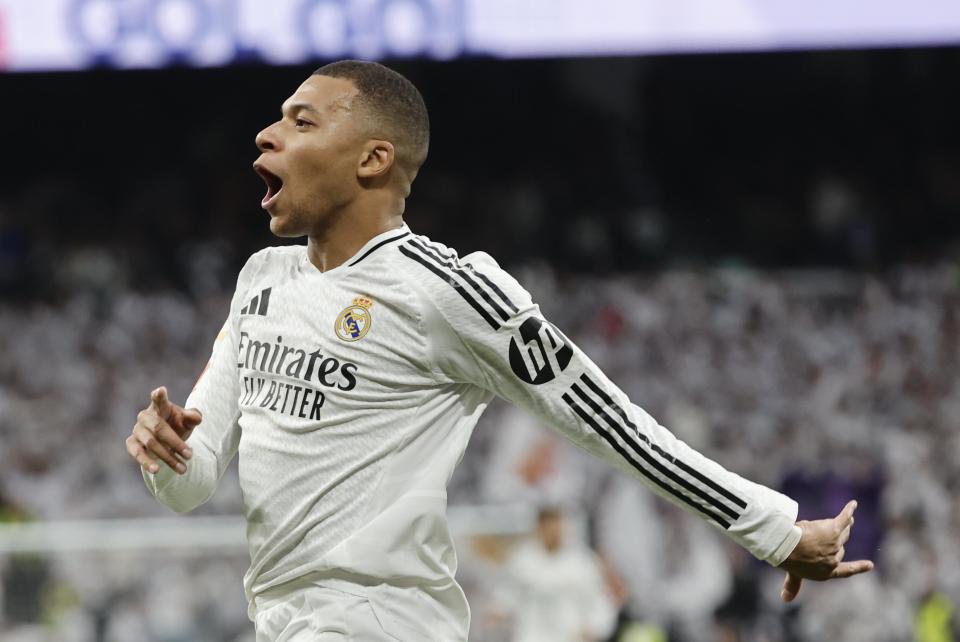 1月19日,皇家马德里队球员姆巴佩庆祝攻入球队首球。新华社/欧新