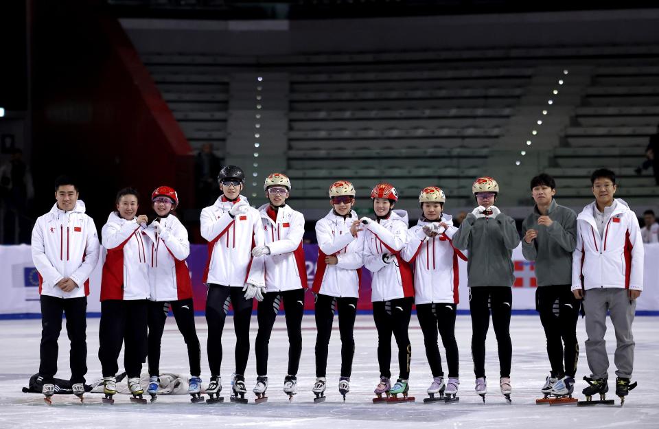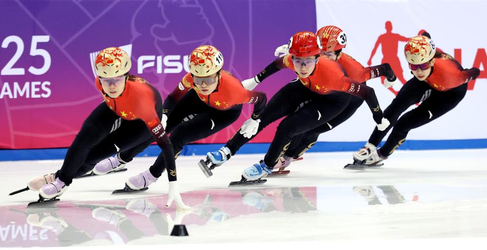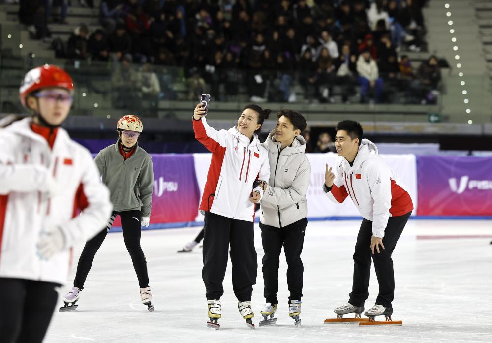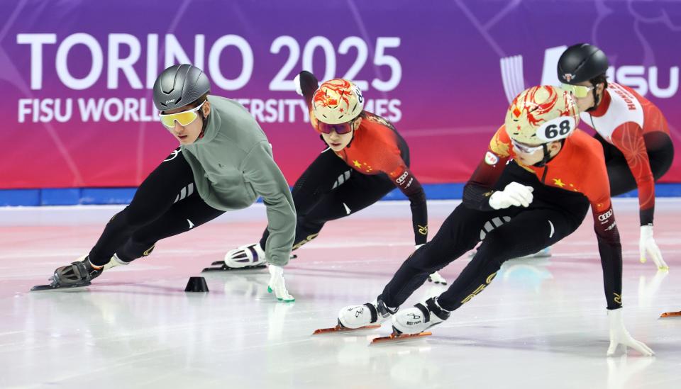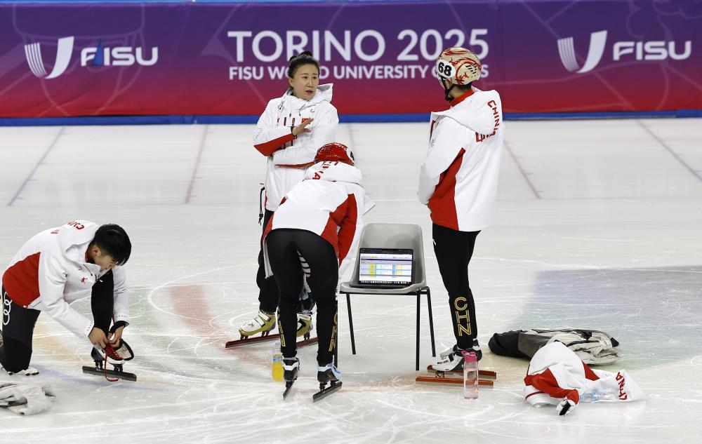 当日,2025年都灵大冬会中国代表团短道速滑队在都灵进行赛前训练。