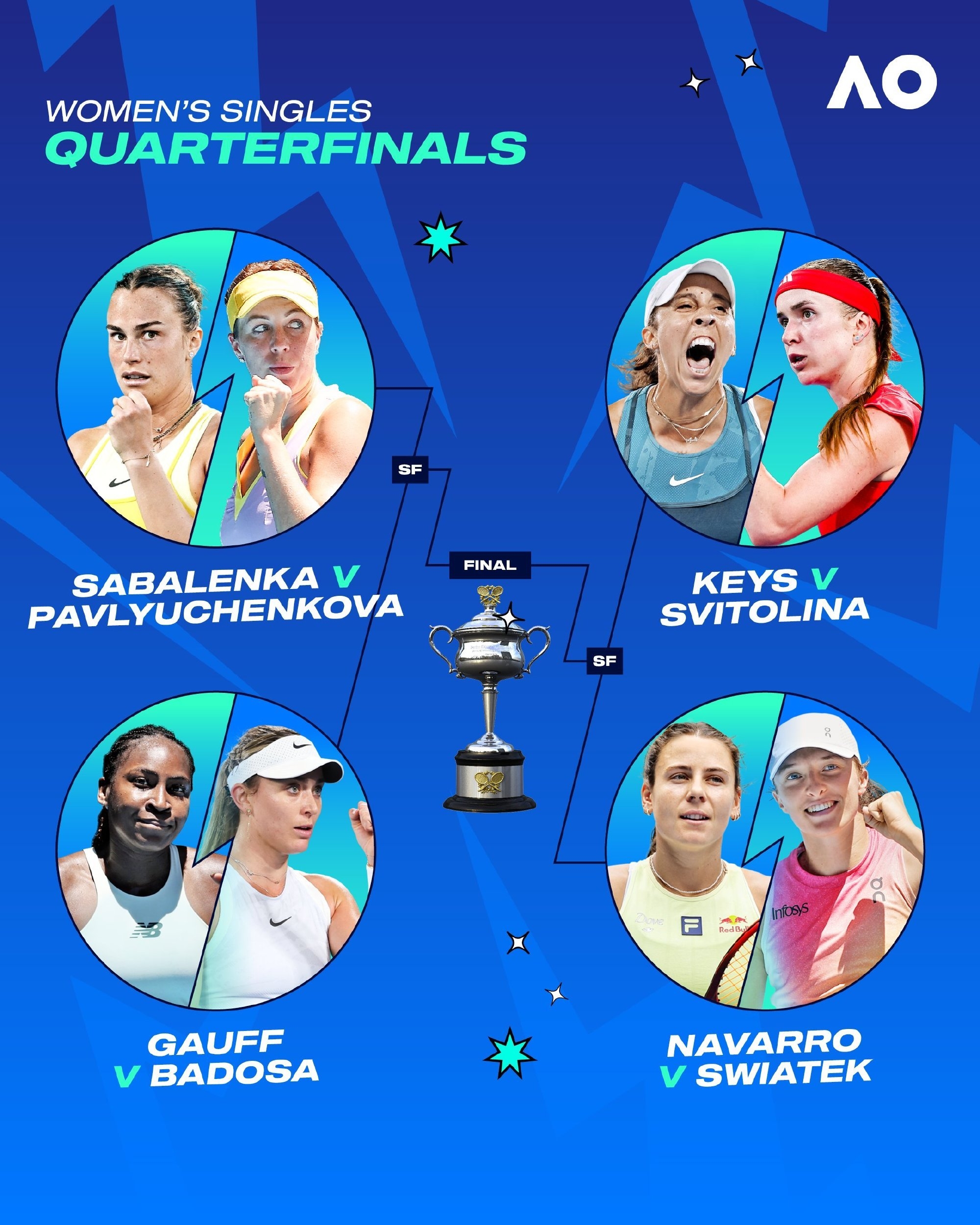 本届澳网女单前8种子仅剩1号种子萨巴伦卡、2号种子斯瓦泰克和8号种子纳瓦罗。其中,斯瓦泰克和纳瓦罗将在1/4决赛交手,打到半决赛前8种子最多剩2人。最终可能是1号种子萨巴伦卡和2号种子斯瓦泰克会师决赛。