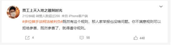 对于这次意外判负,社交平台上也有激烈的讨论,话题一度登上社交平台热搜。有网友认为韩国棋手因为棋艺之外的因素举报,很不道德,也有人觉得既然比赛规则定了就应该遵守。还有人觉得柯洁可能会因此在决胜局爆发。