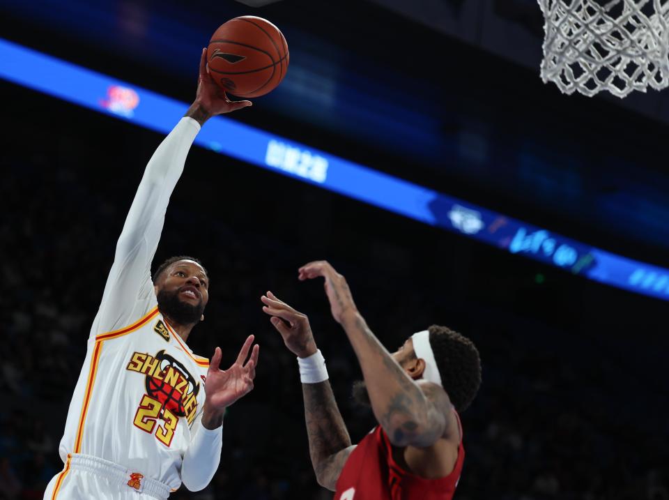 1月22日,深圳马可波罗队球员威姆斯(左)在比赛中上篮。新华社记者 王楷焱 摄
