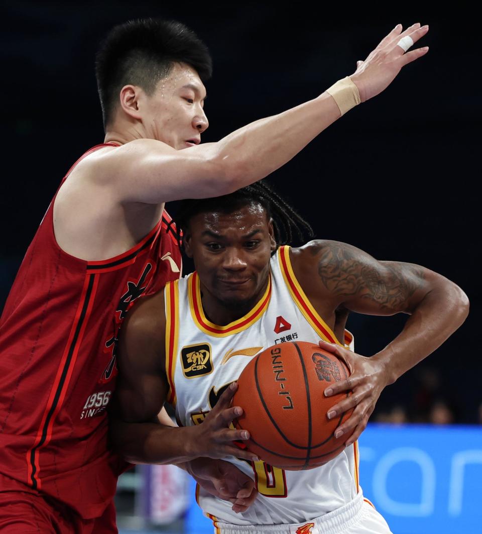1月22日,深圳马可波罗队球员兼主教练周鹏(左)与北京北汽队球员周琦在比赛中。新华社记者 王楷焱 摄