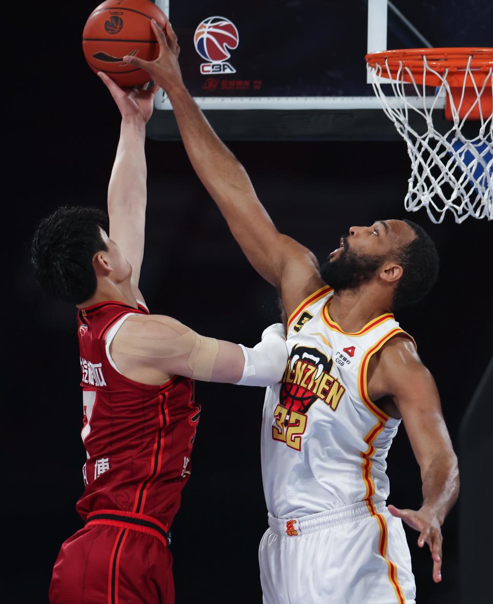 1月22日,深圳马可波罗队球员汤普森(右)在比赛中封盖北京北汽队球员曾凡博。新华社记者 王楷焱 摄