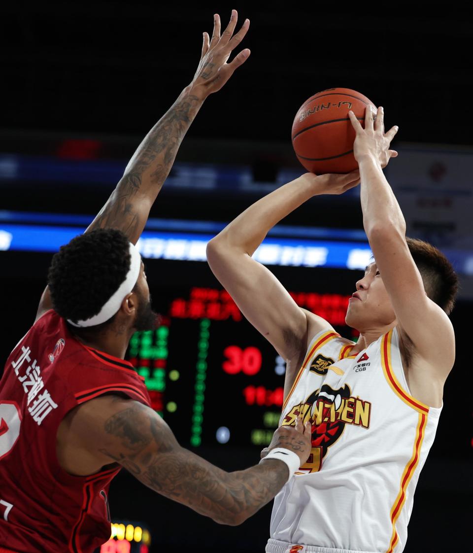 1月22日,深圳马可波罗队球员兼主教练周鹏(右)在比赛中投篮。新华社记者 王楷焱 摄