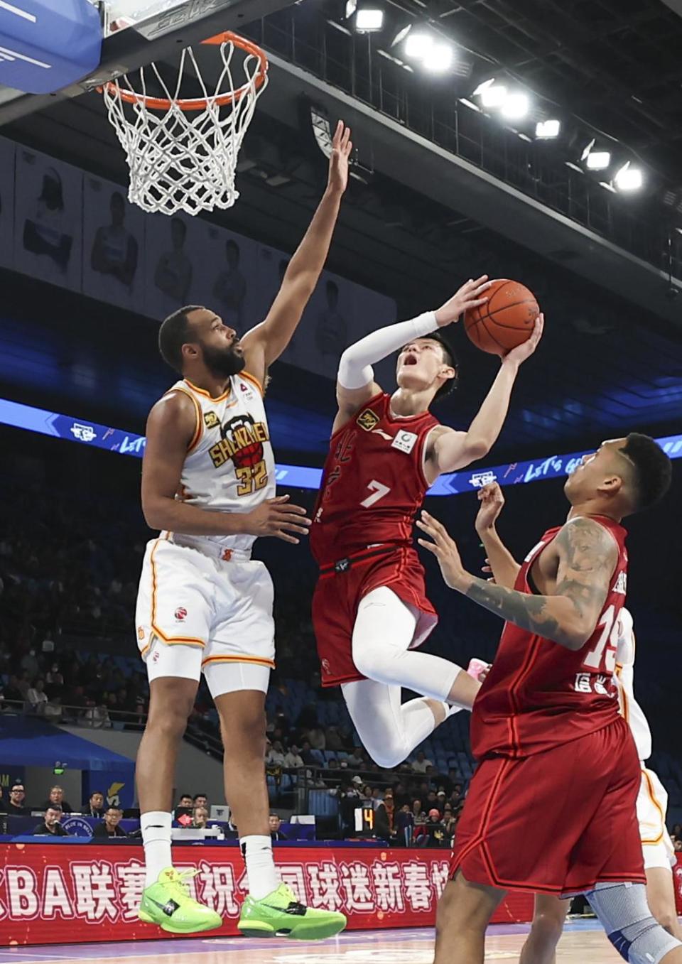1月22日,深圳马可波罗队球员任骏威(上右)在比赛中投篮。新华社记者 王楷焱 摄