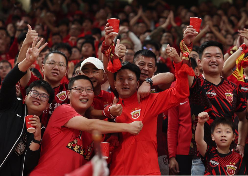 11月2日,上海海港队球迷庆祝本队得分。当日,在2024赛季中国足球协会超级联赛最后一轮比赛中,上海海港队主场5:0战胜天津津门虎队,卫冕中超联赛冠军。新华社记者贾浩成摄