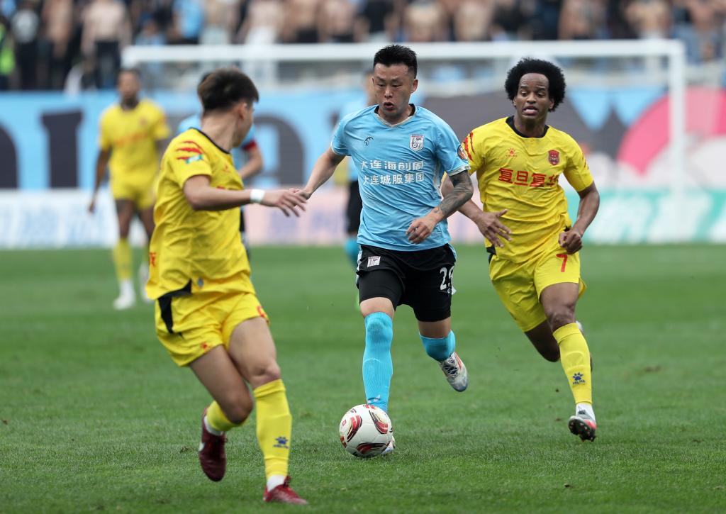 11月3日,大连英博队球员孙铂(中)在比赛中突破。当日,在大连举行的中甲联赛第30轮比赛中,大连英博队主场战胜上海嘉定汇龙队,从而以中甲联赛第二名的成绩获得下赛季中超联赛参赛席位。新华社记者李钢摄