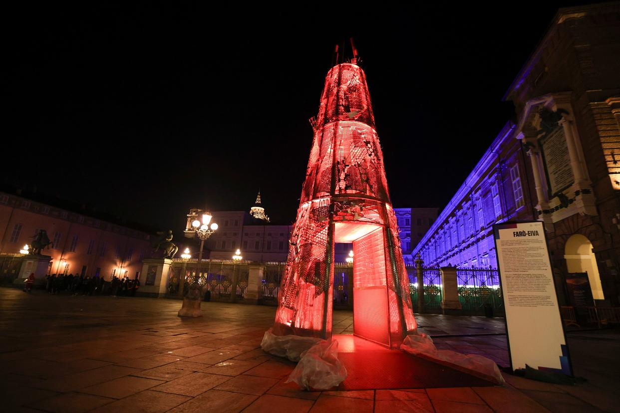 这是1月23日在意大利都灵拍摄的矗立在都灵王宫广场的电子主火炬。新华社记者 李京 摄