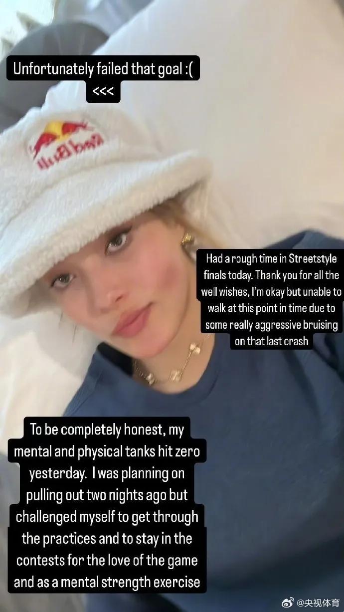 谷爱凌称:“一年后第一次参加坡面障碍世界杯,对今天预赛的表现非常开心,昨晚不小心把脚划破了,比赛中一直流血……吓死我了。赛完后才敢换创口贴,北京时间本周五晚上8点决赛!”
