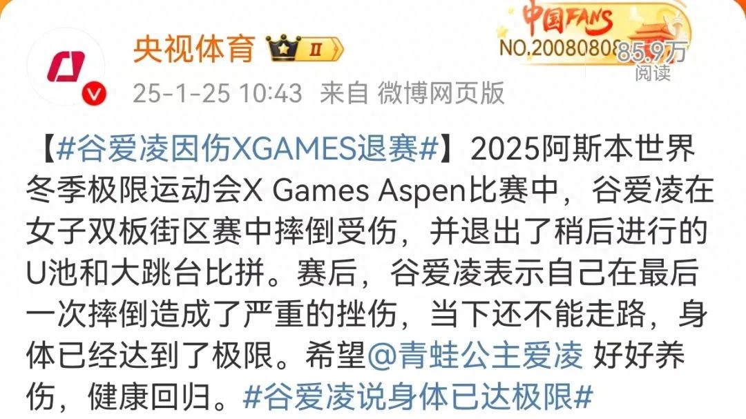1月25日,据@央视体育 消息,2025 XGames Aspen比赛,谷爱凌在Street Style的比赛中摔倒受伤,并退出了稍后的U池和大跳台的比赛。