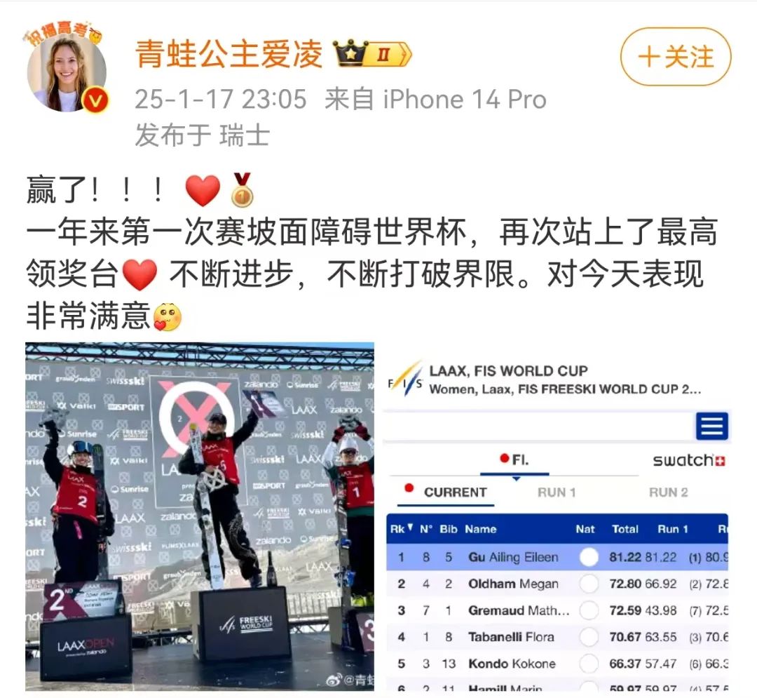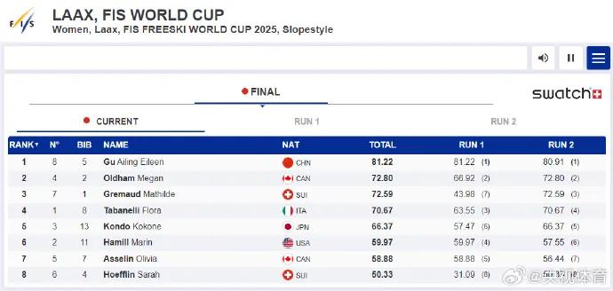 这是谷爱凌获得的第18个世界杯冠军,本赛季世界杯四连冠,第三个坡面障碍技巧世界杯冠军,首次获得莱克斯公开赛冠军。