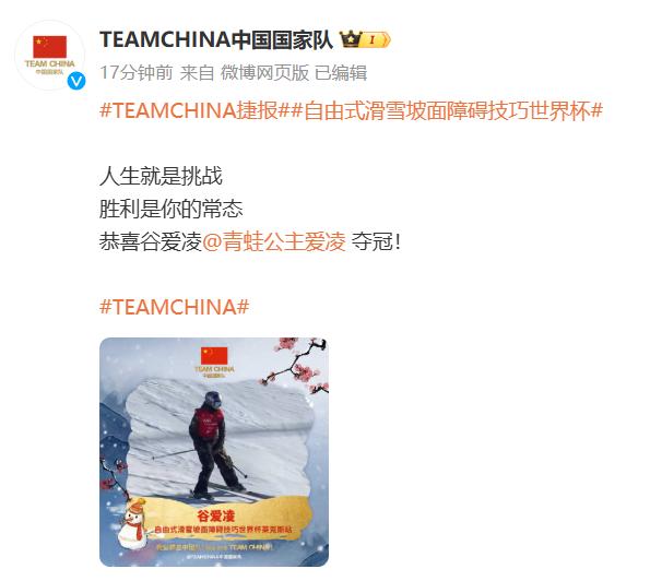 随后,中国国家队发文祝贺:“人生就是挑战,胜利是你的常态,恭喜谷爱凌夺冠!”
