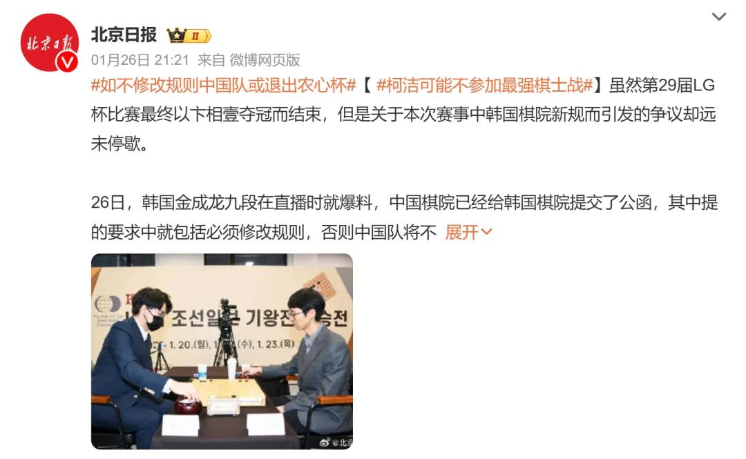 据北京日报,26日,韩国金成龙九段在直播时爆料,中国棋院已经给韩国棋院提交了公函,其中提的要求中就包括必须修改规则,否则中国队将不参加接下来的农心杯第三阶段,而柯洁也有可能不参加最强棋士战。